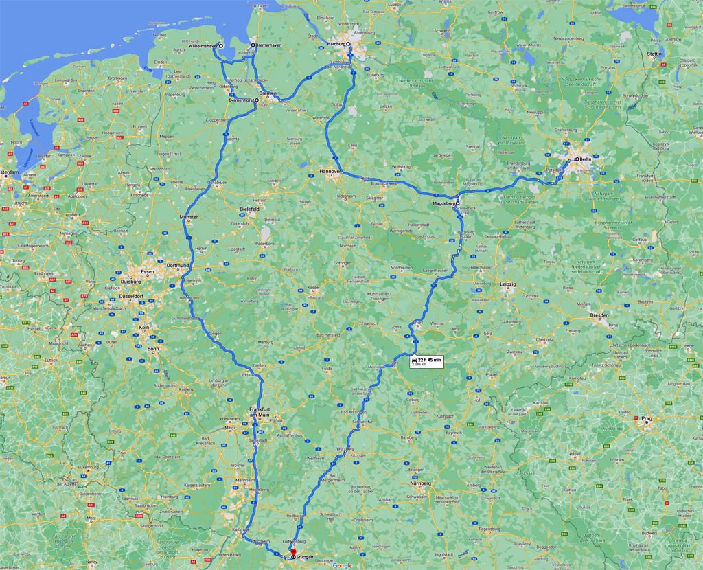 04/2021: 4-Tages-Roadtrip D-Corona3 S-B-HH-BHV-WHV-S (gute 2.000 km, Fahrrad dabei).