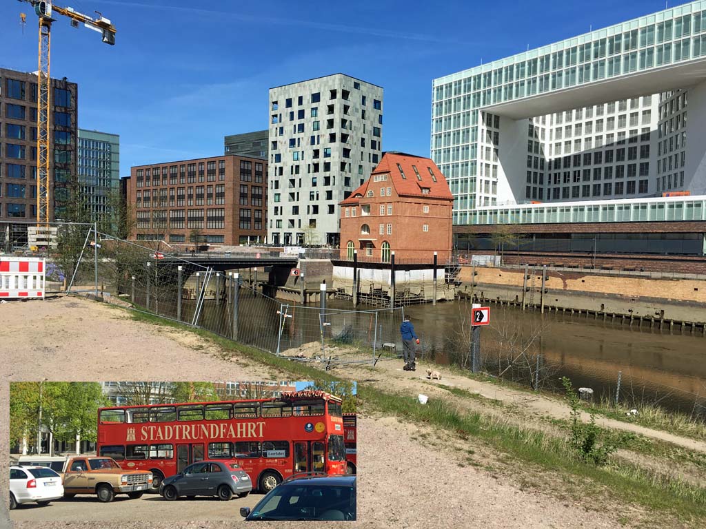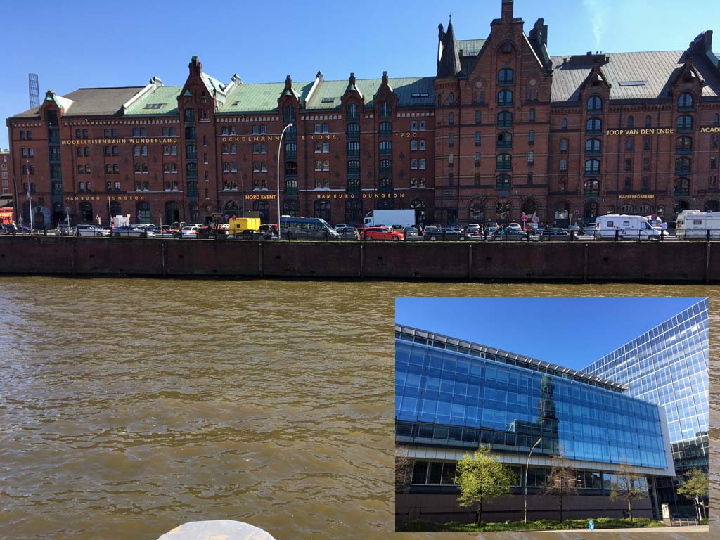 Speicherstadt und der sich spiegelnde Michel.