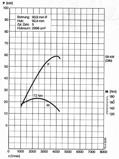 ![]() Leistungs-/Drehmomentverlauf OM617 im 300 GD (C) 1979 Mercedes-Benz |