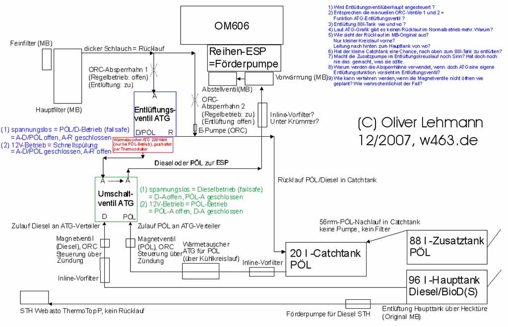 (ehem. Vögele-Tank), für PÖL Bisherige Probleme: (01/2007) (09/2007) Bei den genannten Problemen muss angemerkt werden, dass dieses Vorgehen, den Haupttank weiterhin mit Diesel und den Zusatztank mit PÖL zu betrieben, eher ungewöhnlich ist (ATG und andere Umrüster sehen an sich die Verwendung des Haupttanks für PÖL vor und nehmen einen kleinen Zusatztank für Diesel zu Hilfe) - wir haben dies aufgrund der bereits verbauten Standheizung (Webasto ThermoTop P) so gemacht, da diese auf keinen Fall mit PÖL in Kontakt kommen soll. ORC hat sich als motivierter und zuverlässiger Partner erwiesen, der immer auch an kleinen Innovationen interessiert ist - dort ist man momentan rege damit beschäftigt, G-Modelle auf Gas (LPG) umzurüsten. (10/2007) Umrüstung (Stand 11/2007):